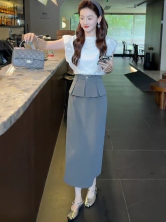 この2color ロング丈ペプラムスカートは、女性らしさを引き立てながらも、落ち着いた雰囲気を漂わせるスタイルが特徴です。