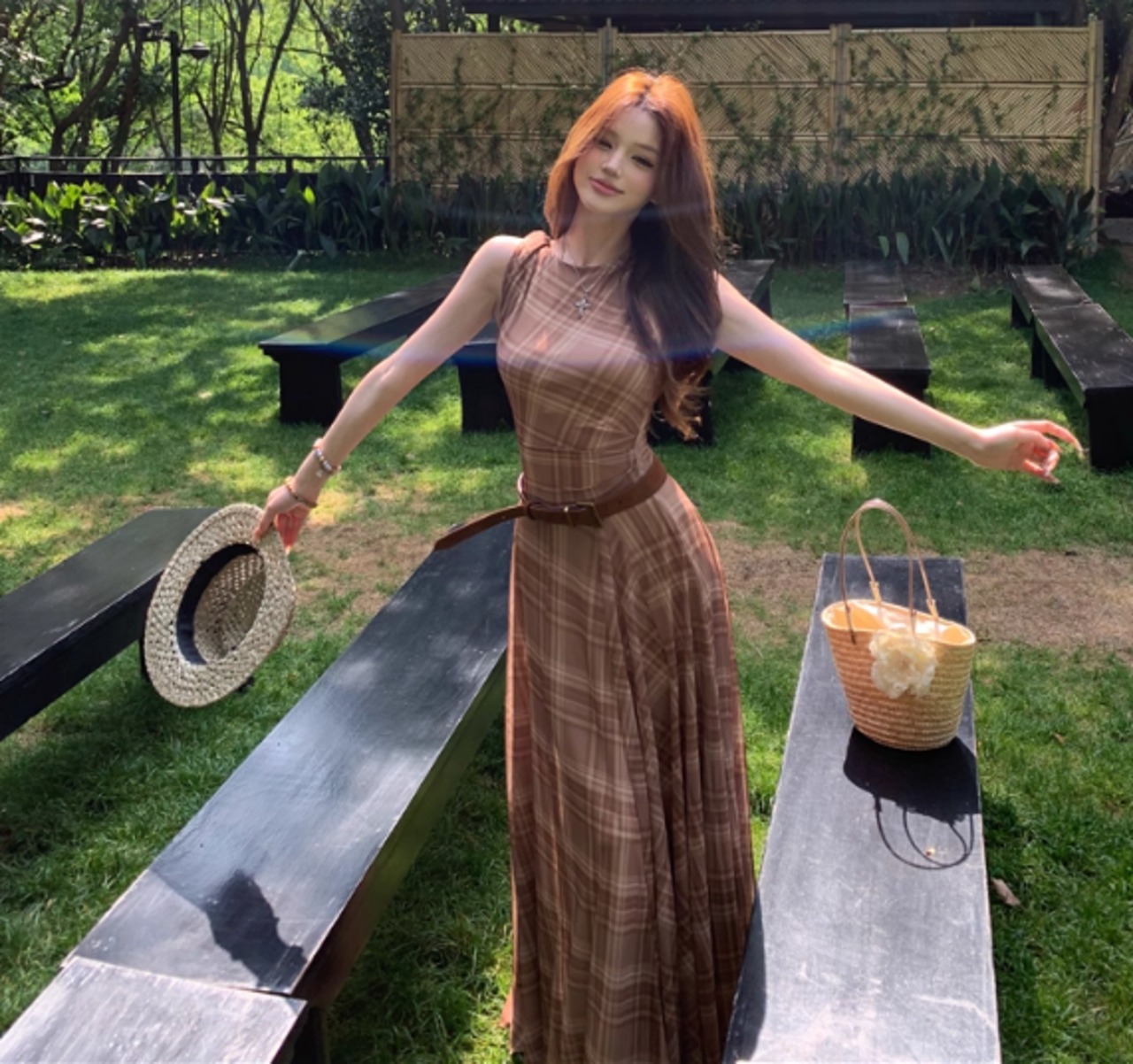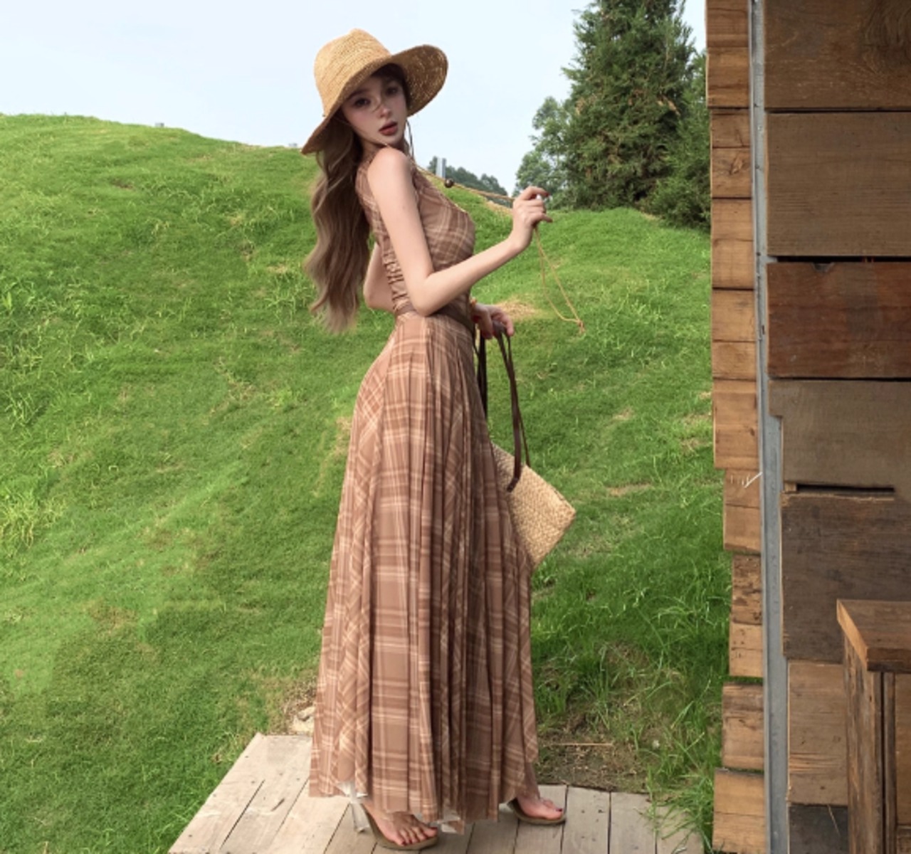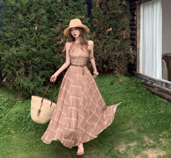 このチェック柄ロングワンピースは、クラシックさと女性らしさを兼ね備えた魅力的なアイテムです。