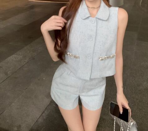 **大人気♡水色コーデ♡襟付きノースリーブトップス+ショーパンセットアップが新登場です!**