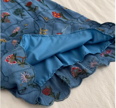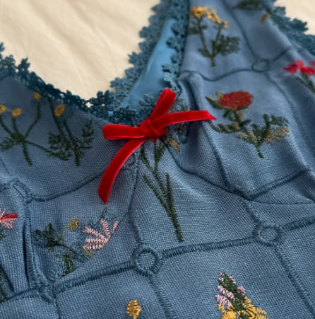 こちらのワンピースは、繊細なフラワー刺繍が特徴的です。