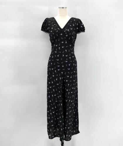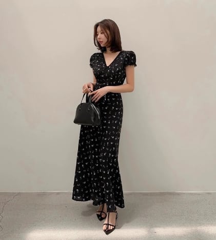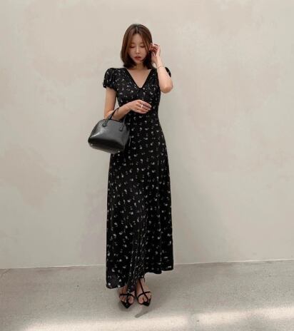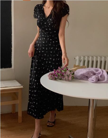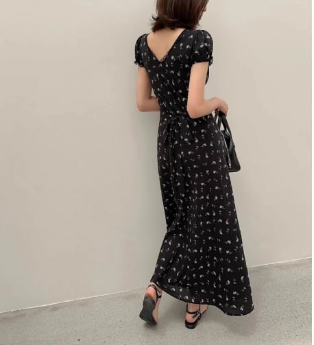 大人かわいい♡小花柄vネック半袖ロングワンピース