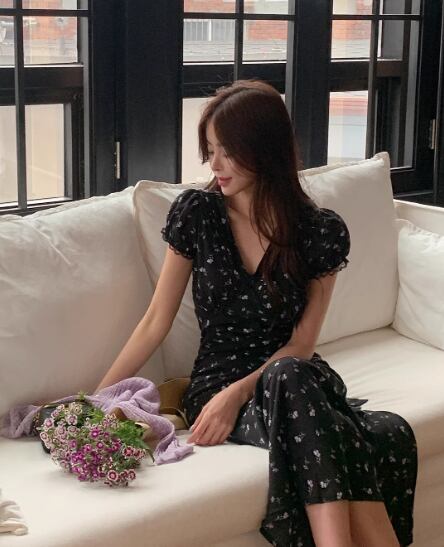 この小花柄vネック半袖ロングワンピースは、愛らしさと大人っぽさを兼ね備えたデザインが特徴です。