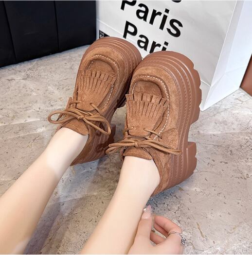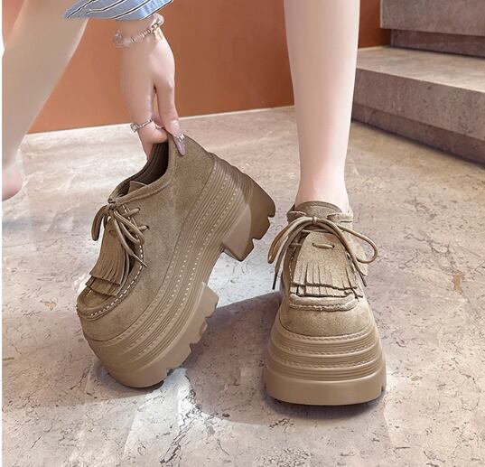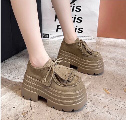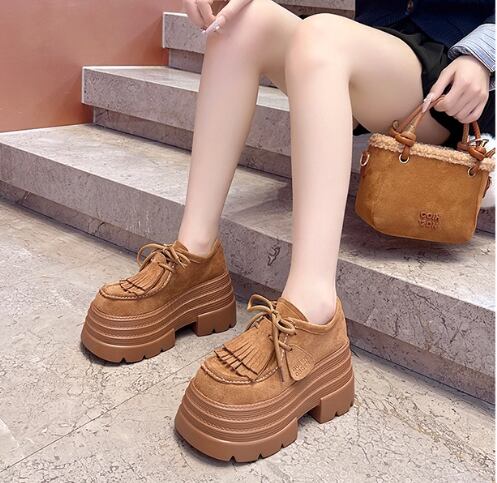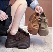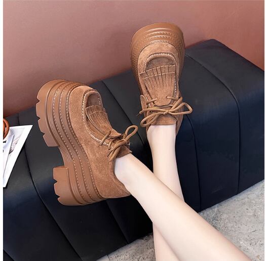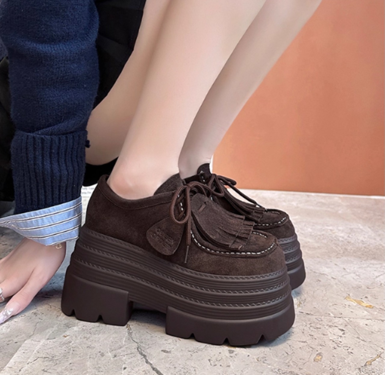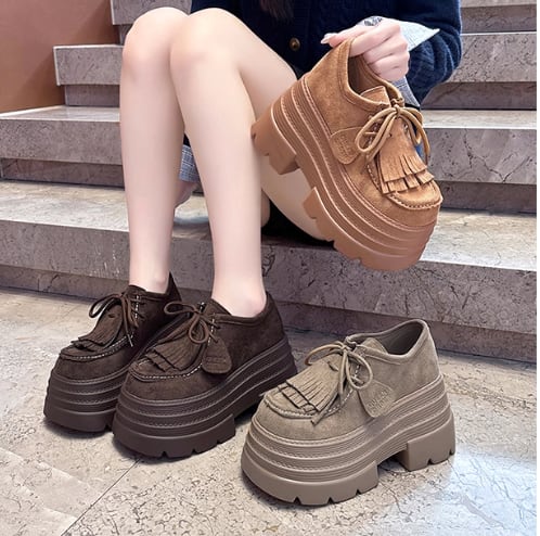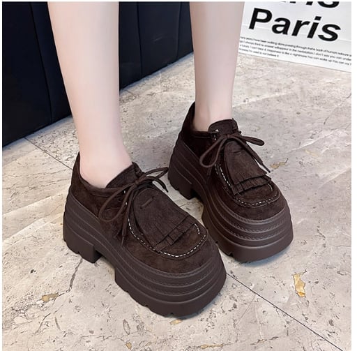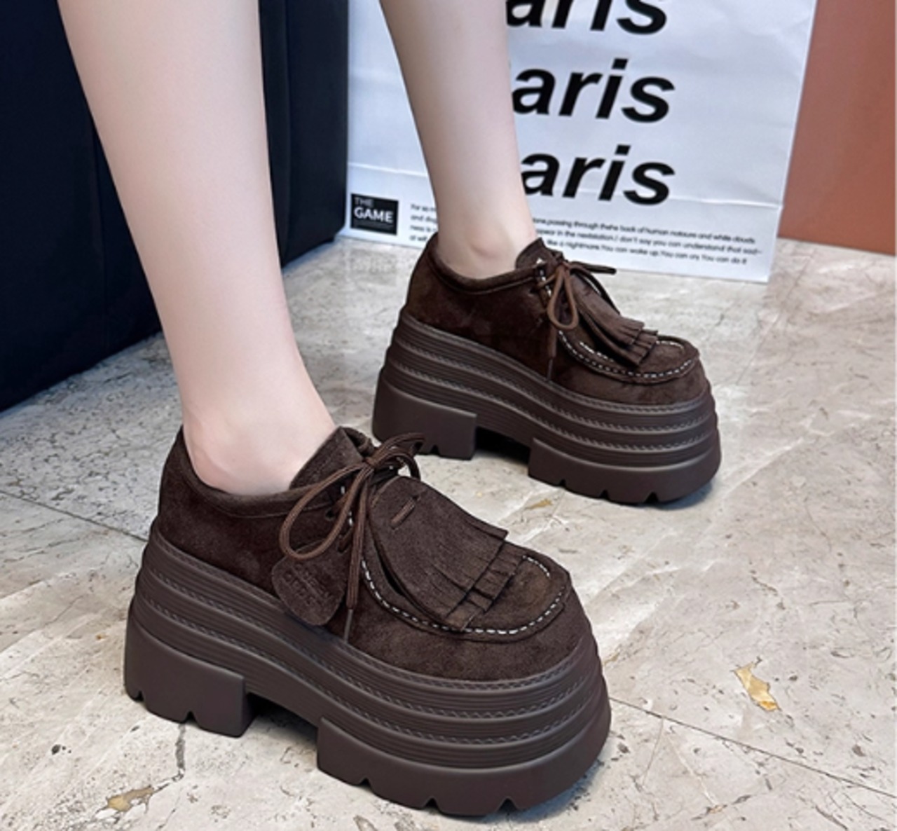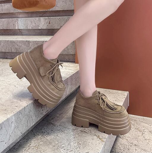 この厚底シューズは、レトロなスタイルとカジュアルな雰囲気を兼ね備えています。