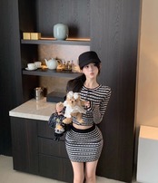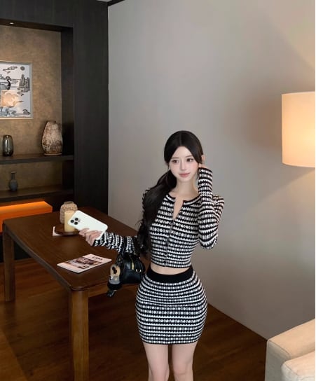 このカーディガン+タイトミニスカートセットアップは、ショート丈のカーディガンが絶妙にコーディネートを引き立て、細見え効果を実現します。
