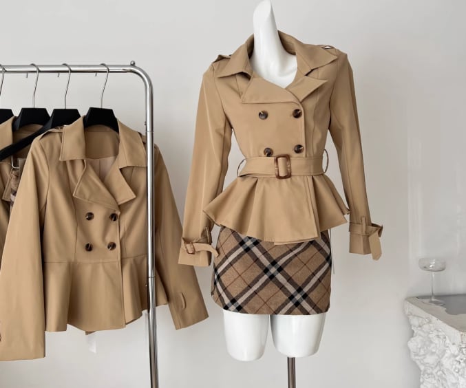 ペプラムショート丈コート+チェック柄ミニスカートセットアップで、あなたのスタイルをアップデートしてください!