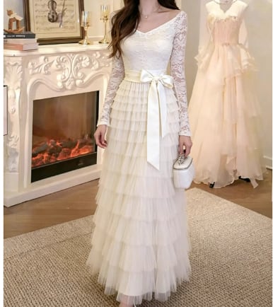 この上品レース×フリルロングワンピースは、フレンチガーリーな雰囲気を醸し出す魅力的なデザインです!