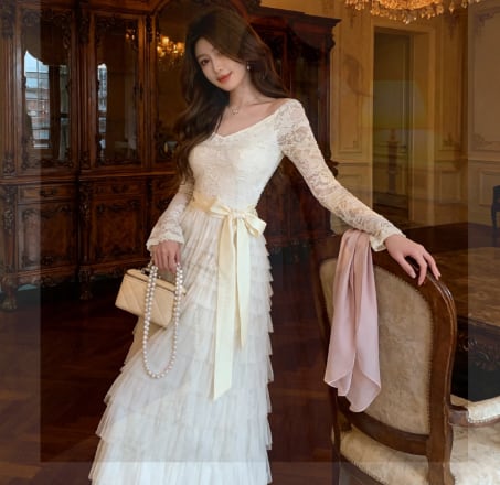 2color フレンチガーリー♡上品レース×フリルロングワンピースで、あなたのおしゃれをワンランクアップさせましょう!