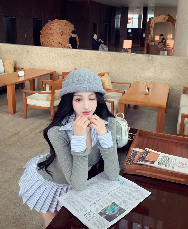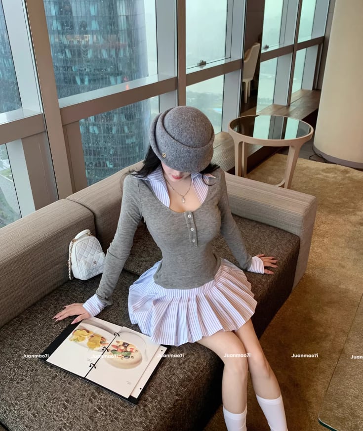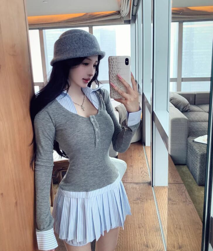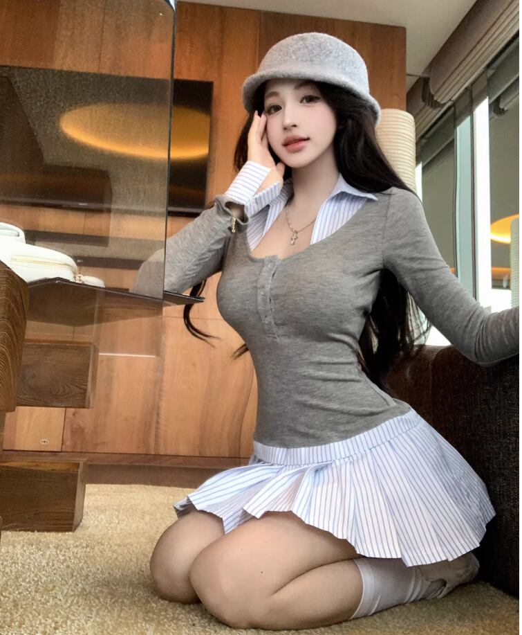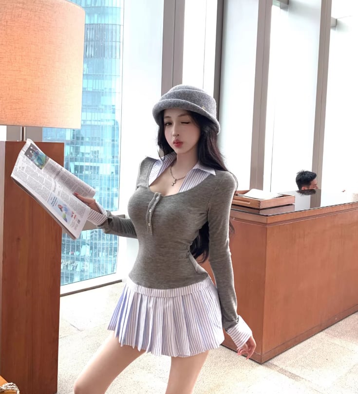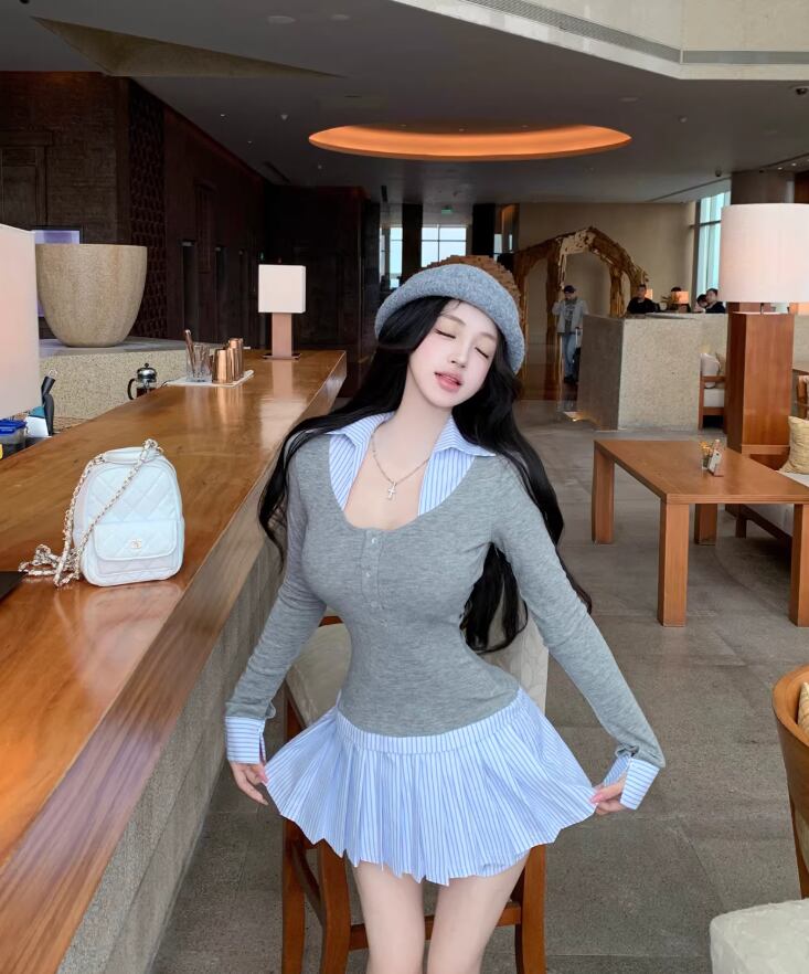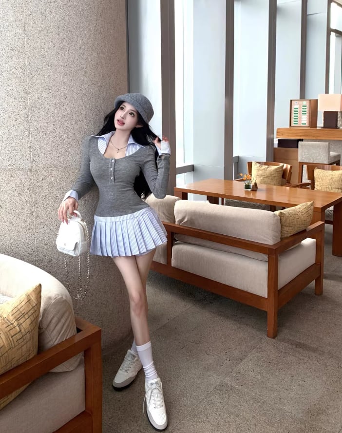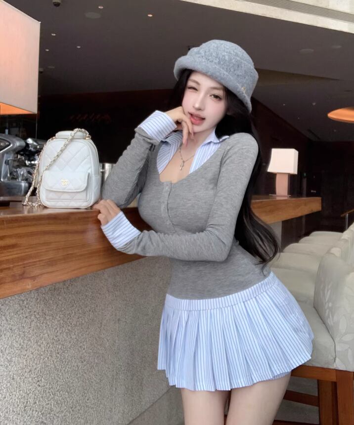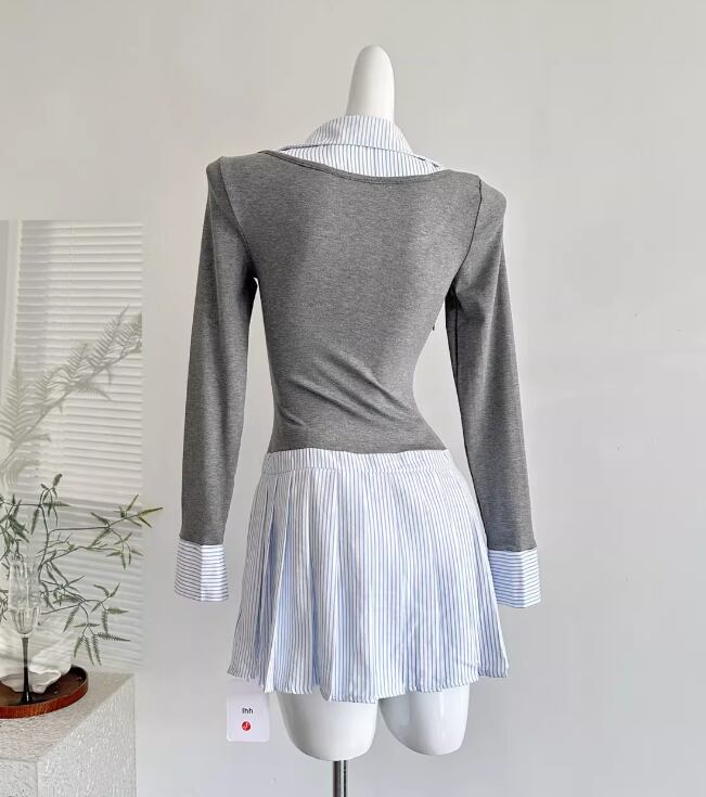 重ね着風♡ストライプシャツドッキングプリーツミニワンピースで、あなたのワードローブに新たな魅力を加えましょう!