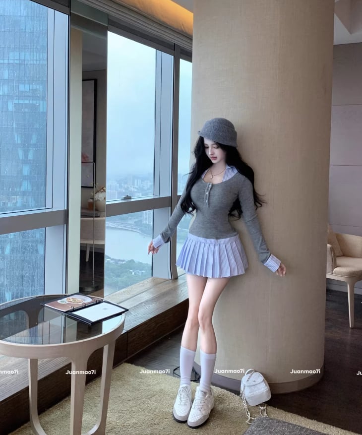 このワンピースは重ね着風のストライプシャツとプリーツスカートがドッキングした、ユニークでおしゃれなデザインが特徴です!