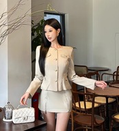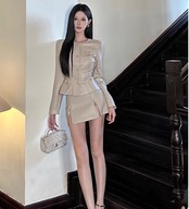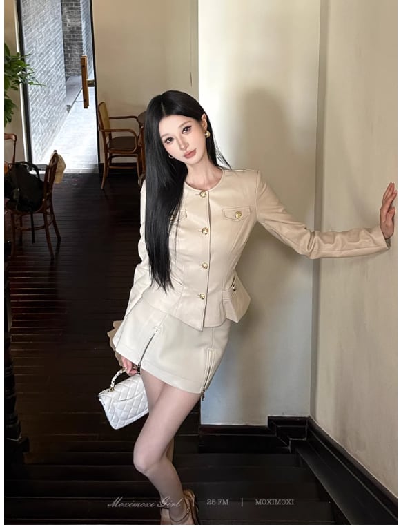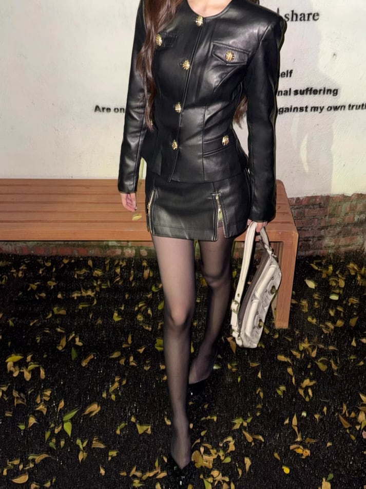 このレザージャケットとミニスカートのセットは、スタイルアップ効果に優れたデザインが特徴です!