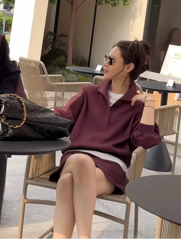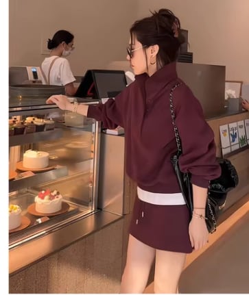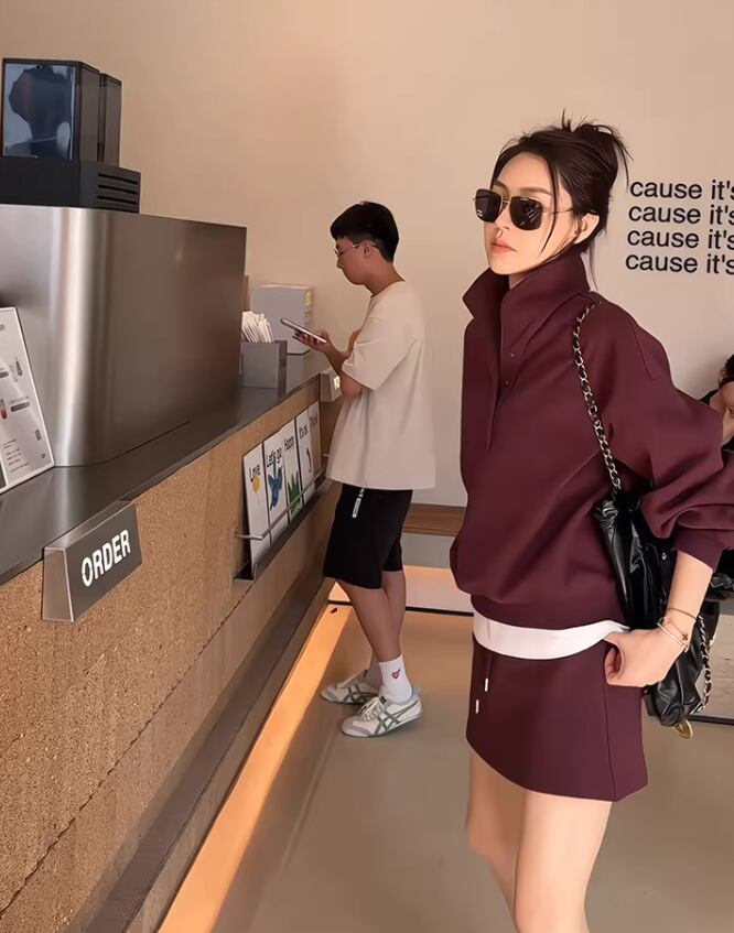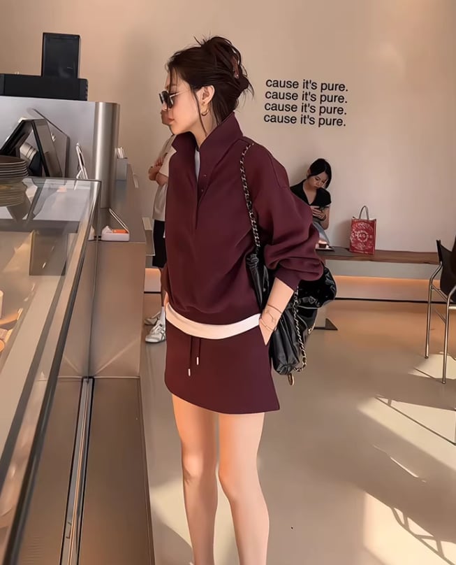 スポーティー♡ワインレッドスウェットトップス+ミニスカセットアップで、アクティブなスタイルをさらに楽しみましょう!