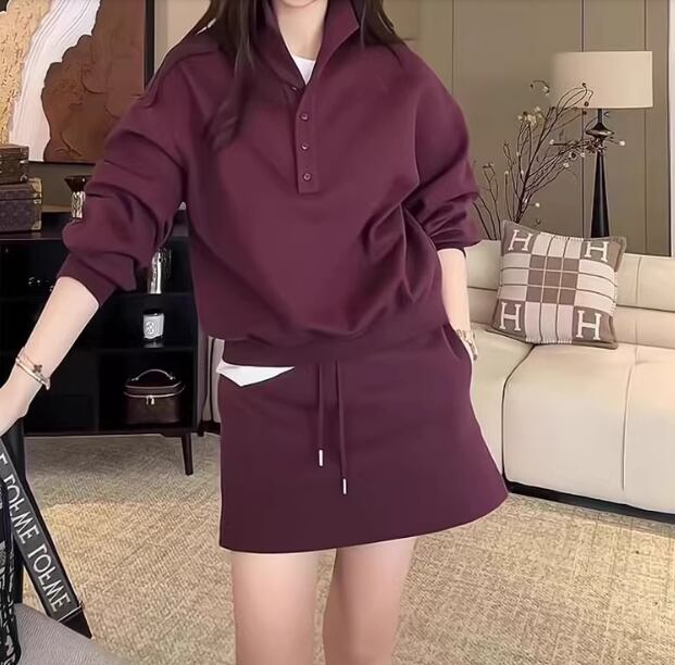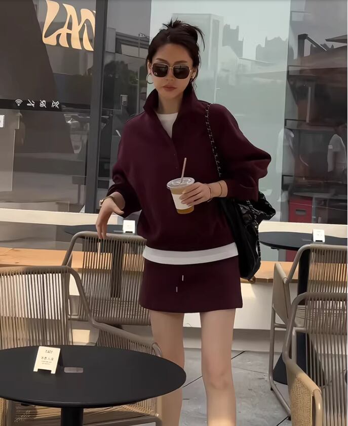 このワインレッドのスウェットトップスとミニスカートのセットアップは、スポーティーな印象を与えつつも、女性らしさを引き立てるデザインが特徴です!