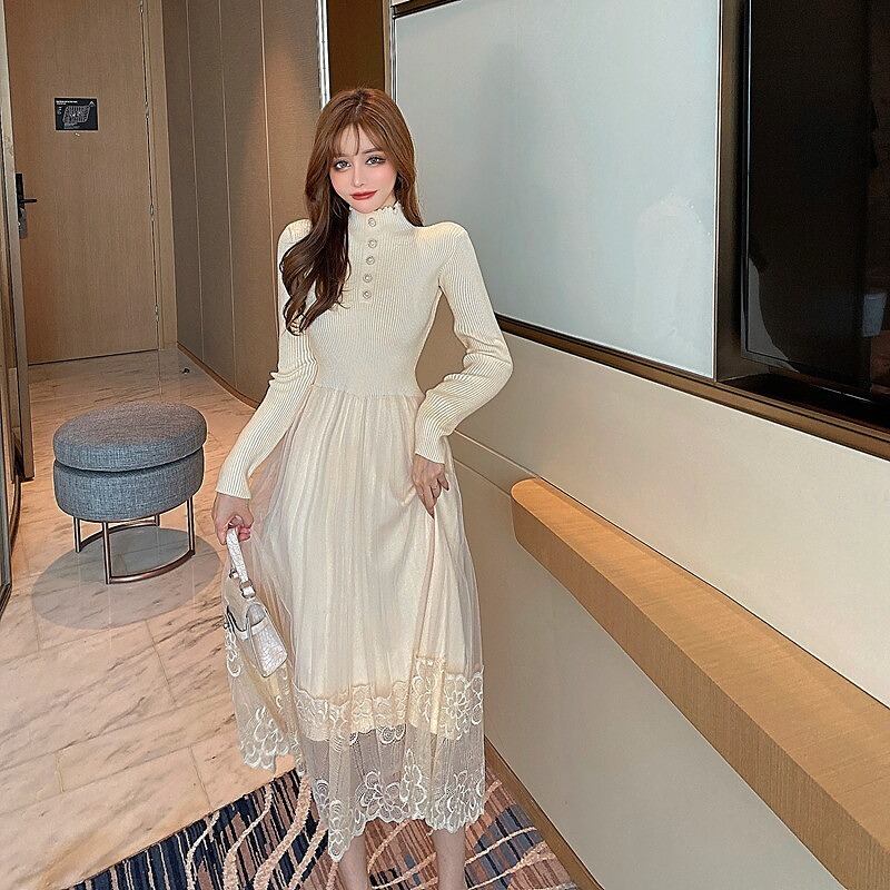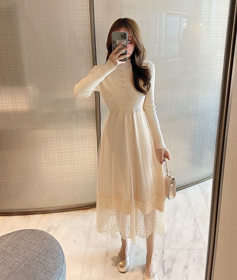 2color 花柄レースが大人かわいい♡セミハイネックニットワンピ