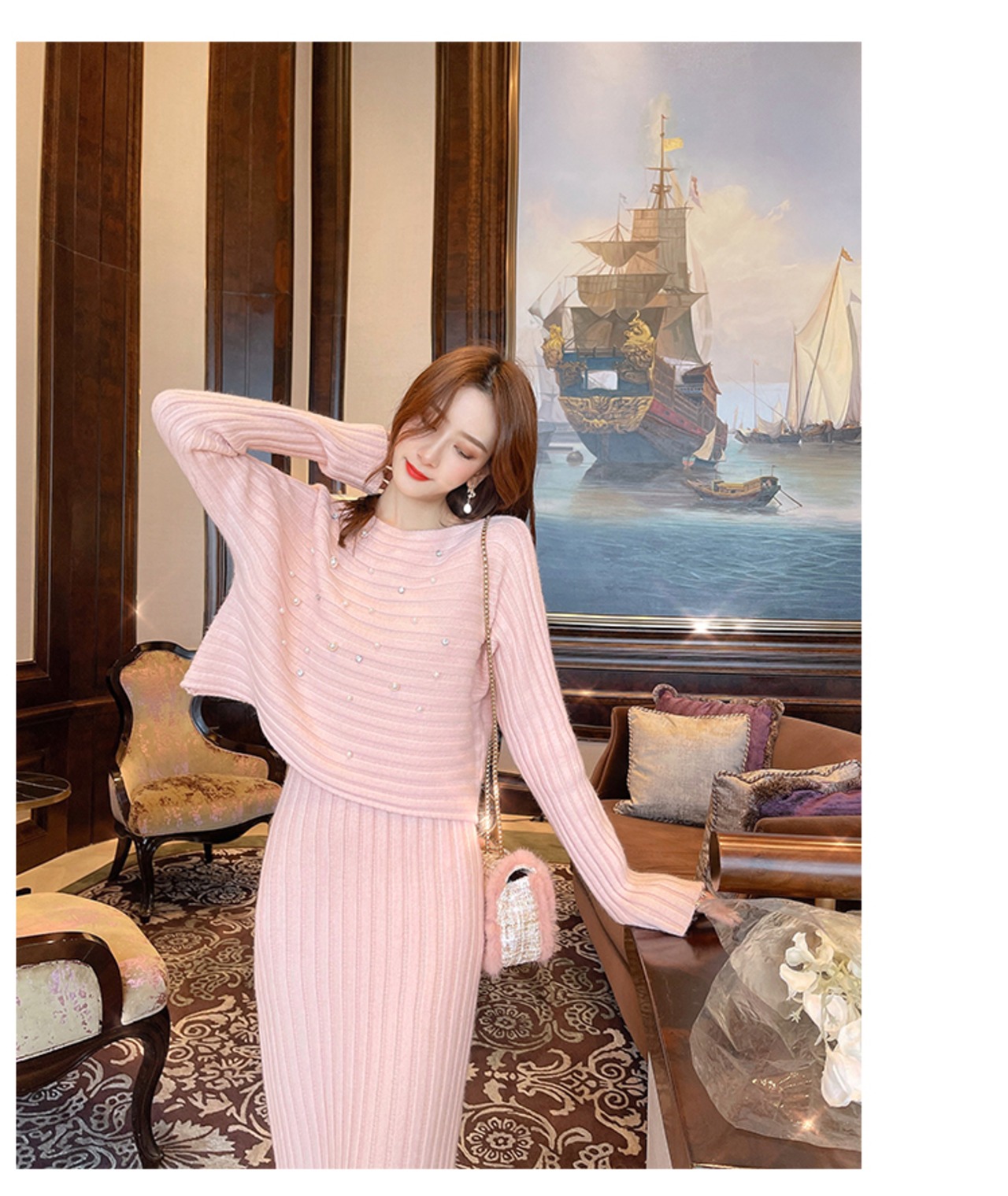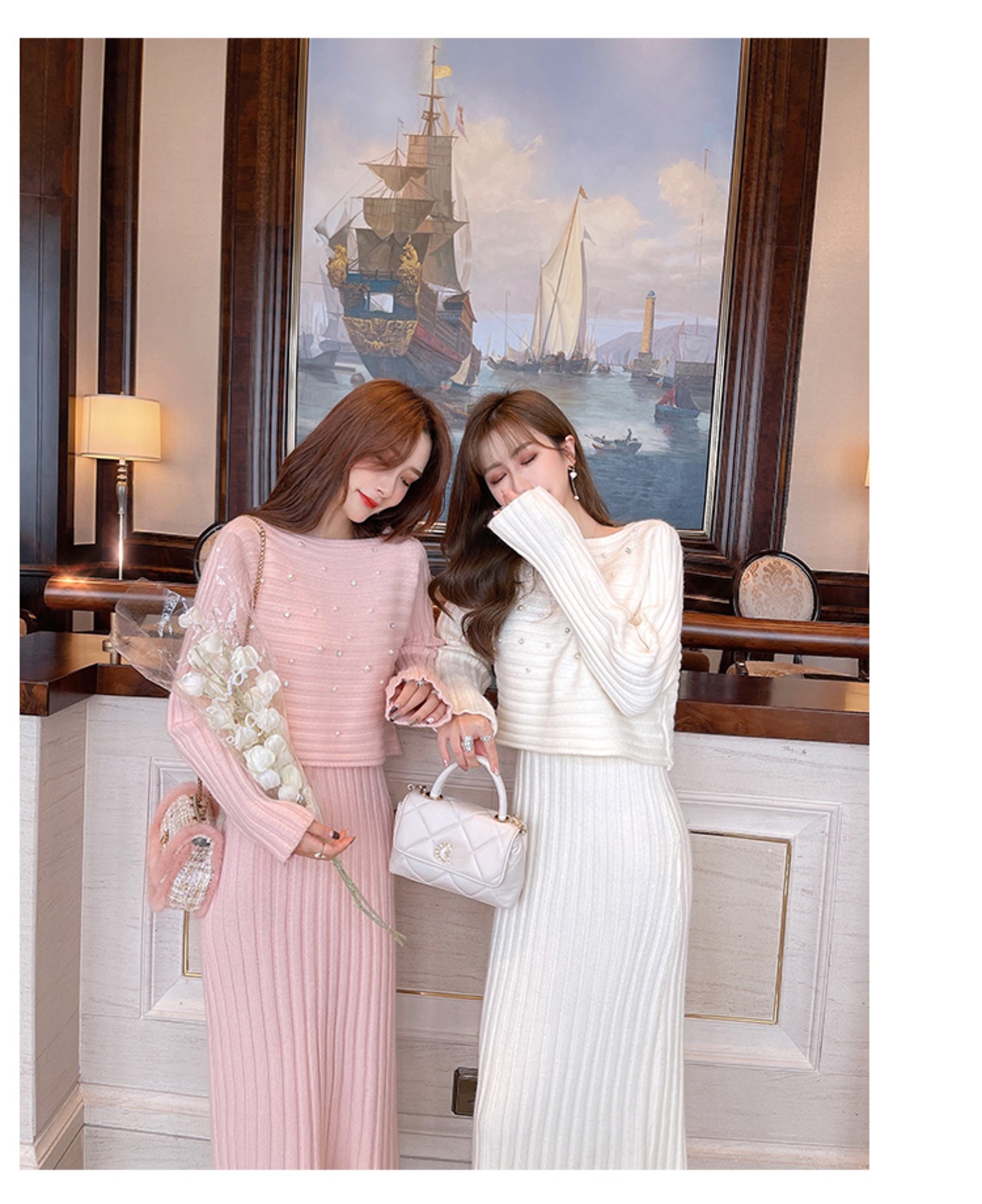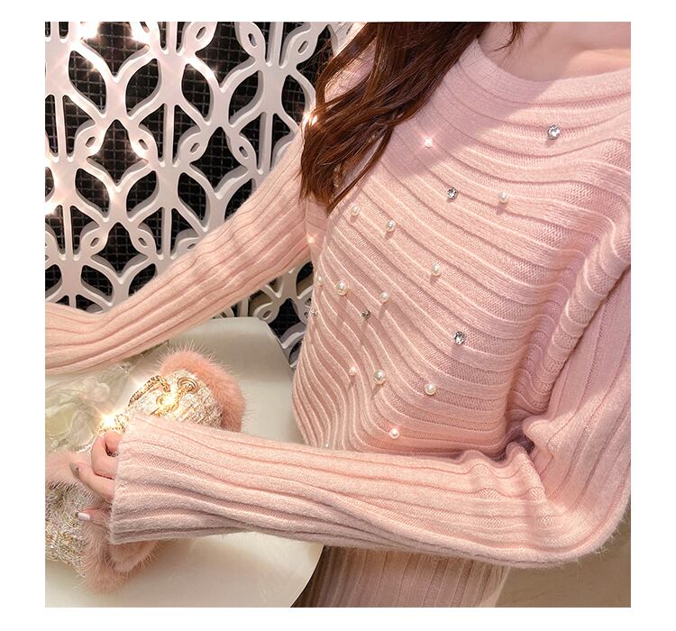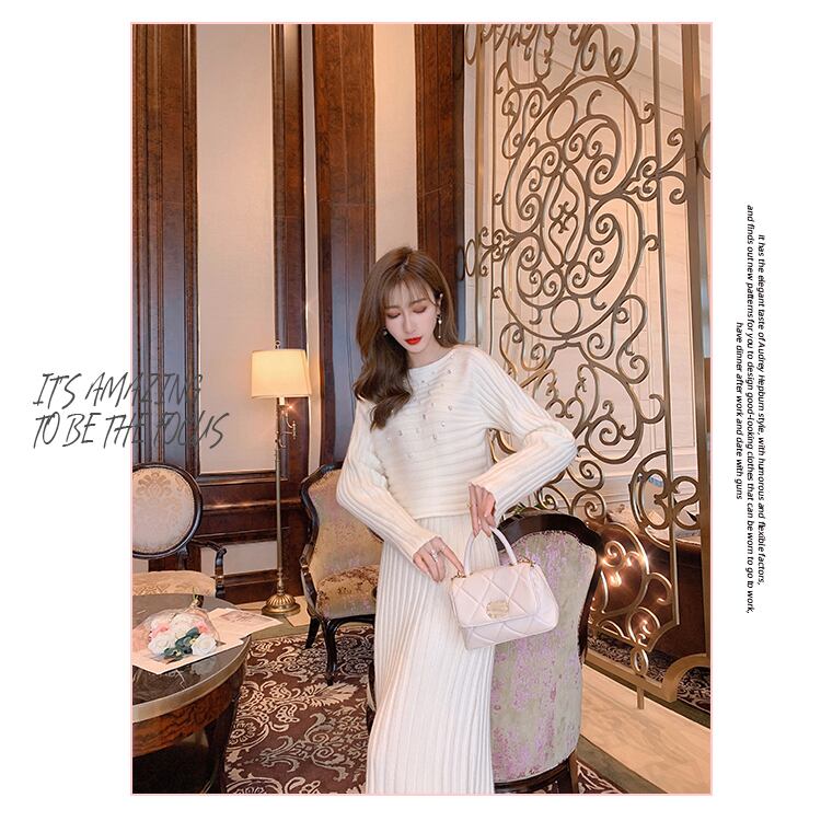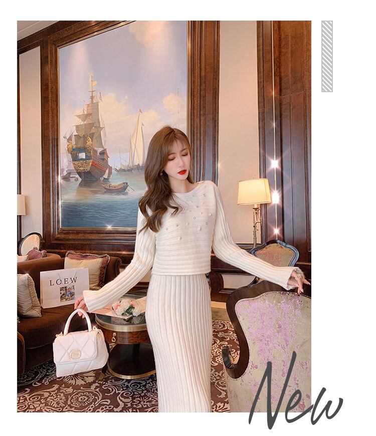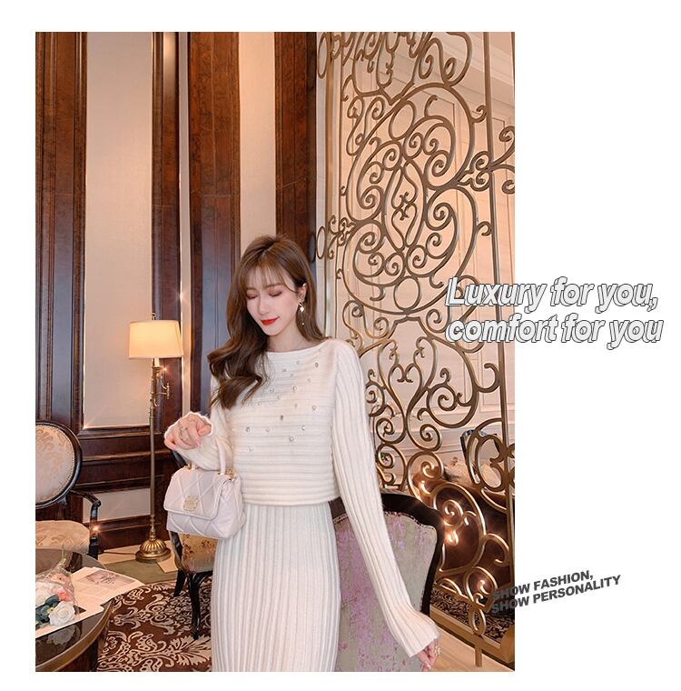 3color ビジュー付きニットトップス+ロングスカートセットアップ