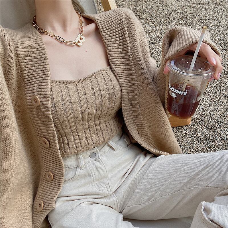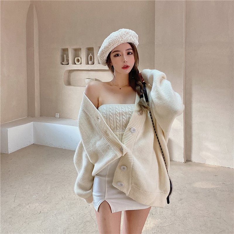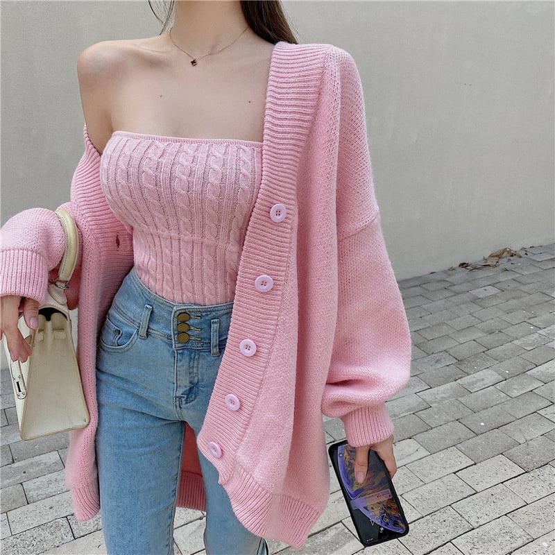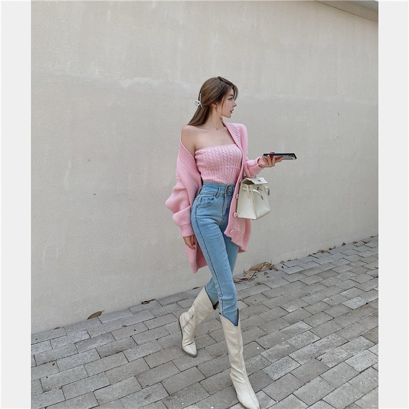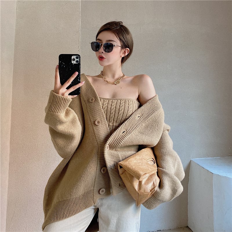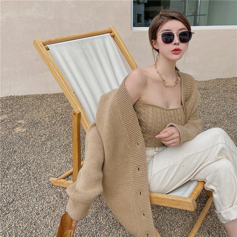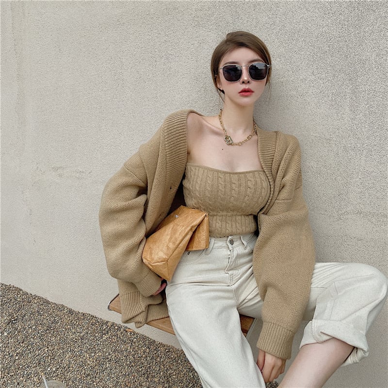 3color ベアトップ+ニットカーディガンセット