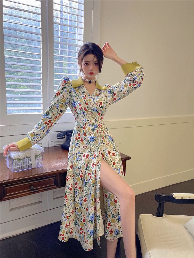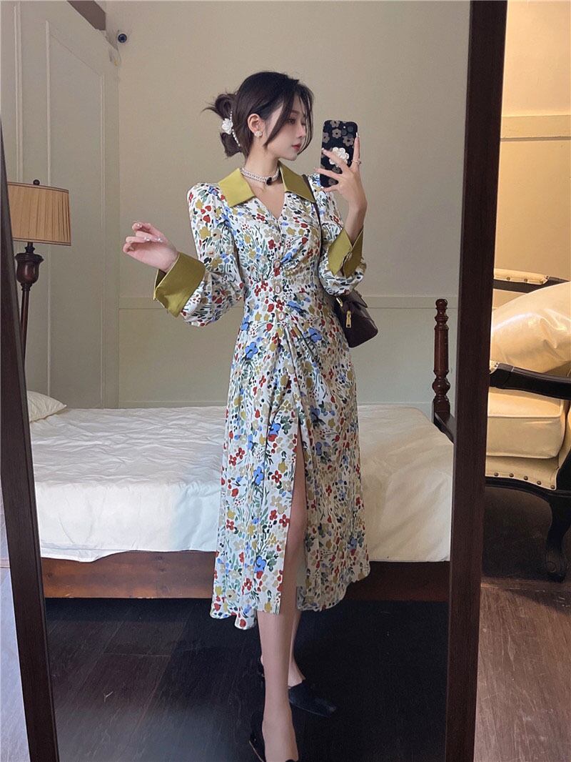 エレガント♡ロング丈花柄レトロワンピース