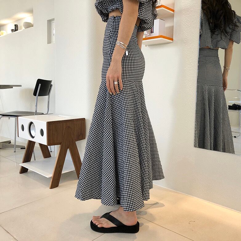 ちらっと肌みせ♡チェック柄トップス+ロングスカートセットアップ