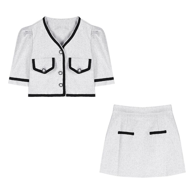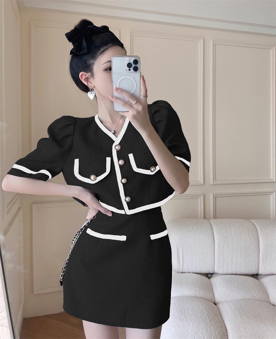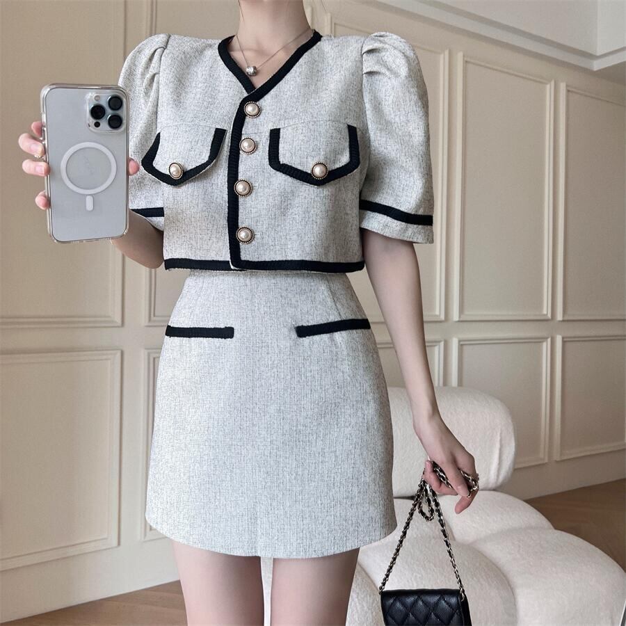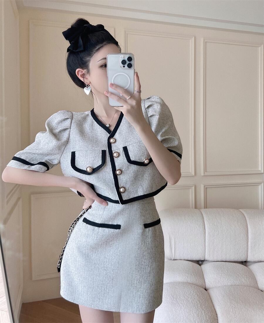 2color プチプラ高見え♡パールボタン半袖トップス+ミニスカートセットアップ