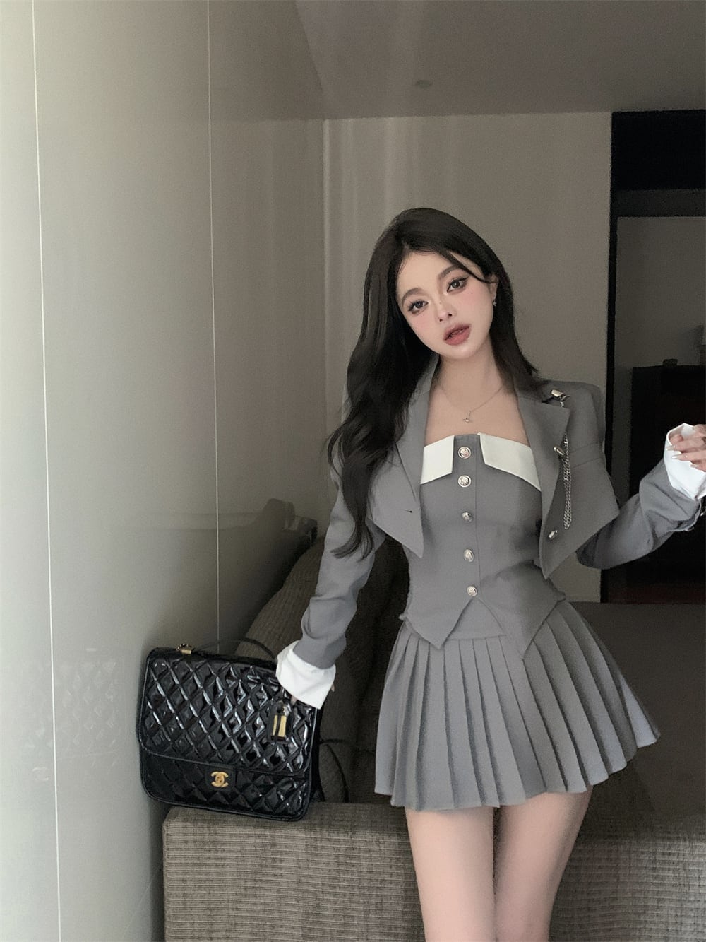 かわいらしいベアトップに、制服のようなデザインが施されたショート丈ジャケット、そして、女性らしさを引き立てるプリーツミニスカートがセットになっています。