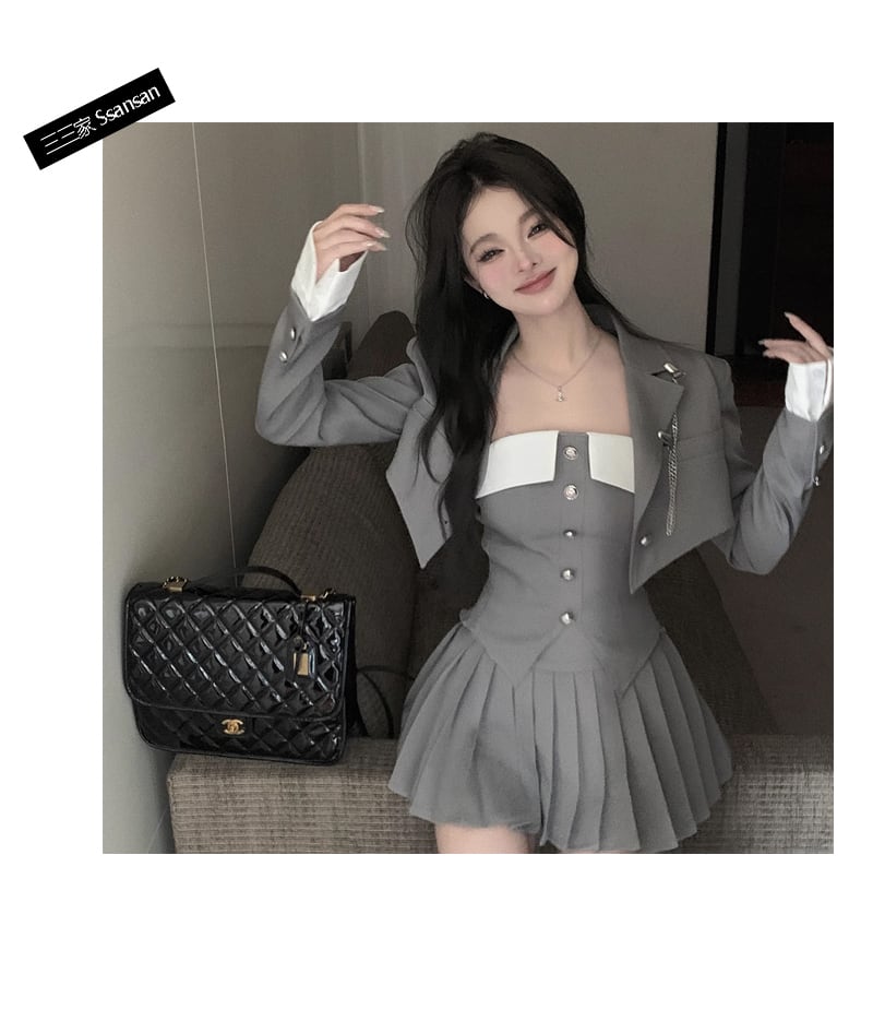 スクールガールファッションの決定版、制服風ベアトップ+ショート丈ジャケット+プリーツミニスカートセットアップ!