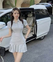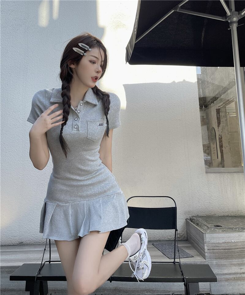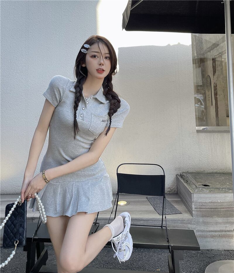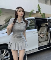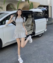 プリーツがかわいい♡ガーリーカジュアルポロシャツ風半袖ミニワンピ