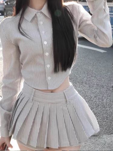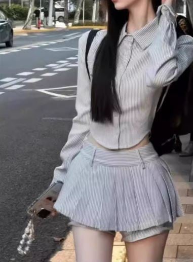 大人気♡ストライプシャツ+プリーツキュロットスカートセットアップ