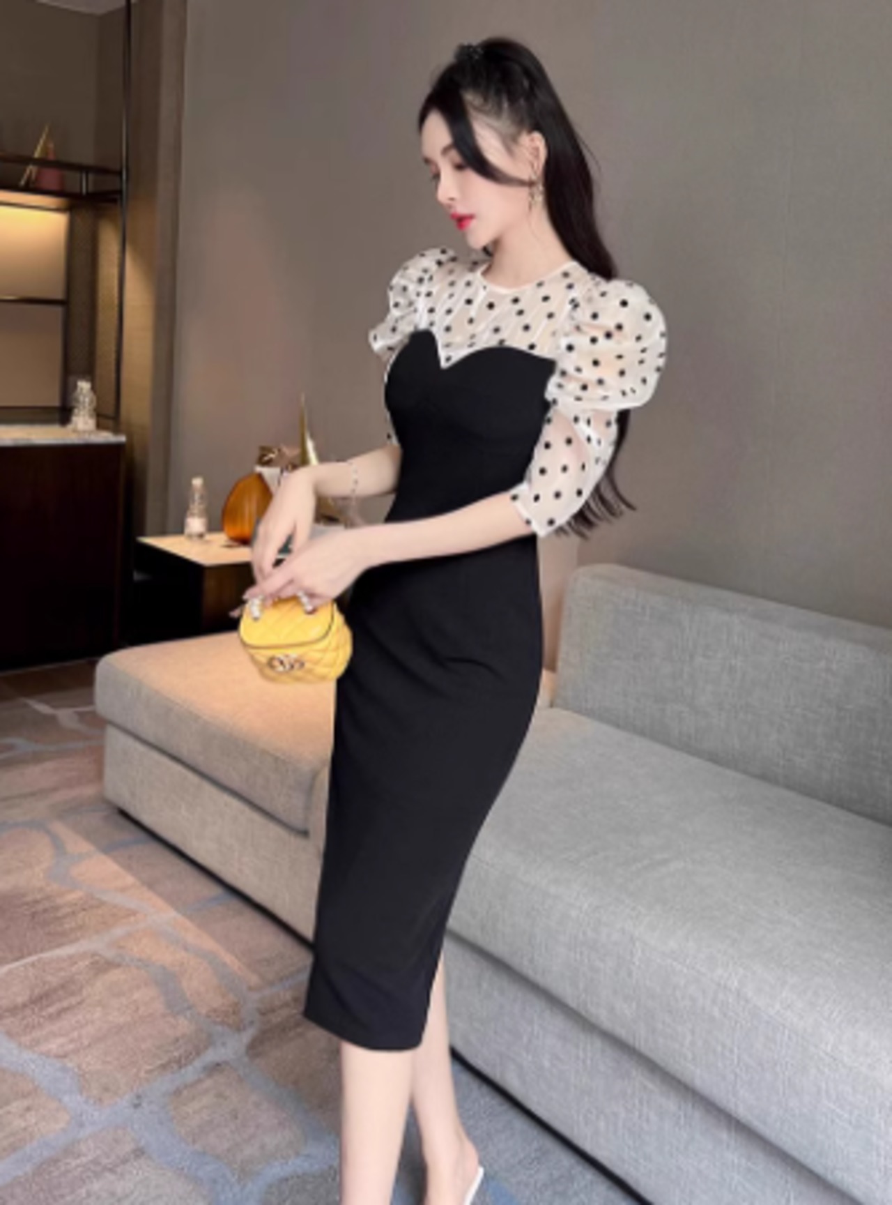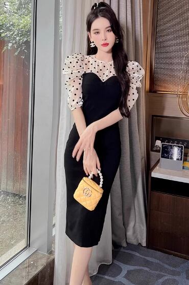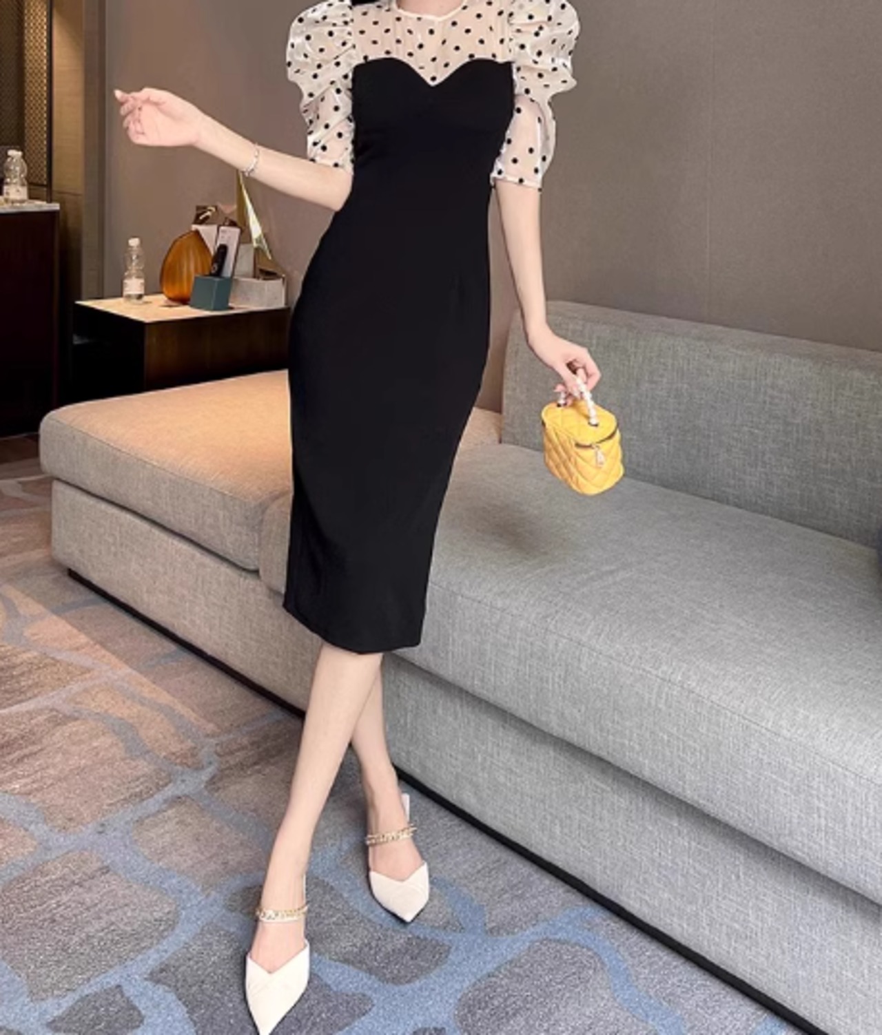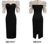 ドット柄と透け感のあるシアースリーブが女性らしさを引き立て、ひざ丈のシルエットが上品な印象を与えます。