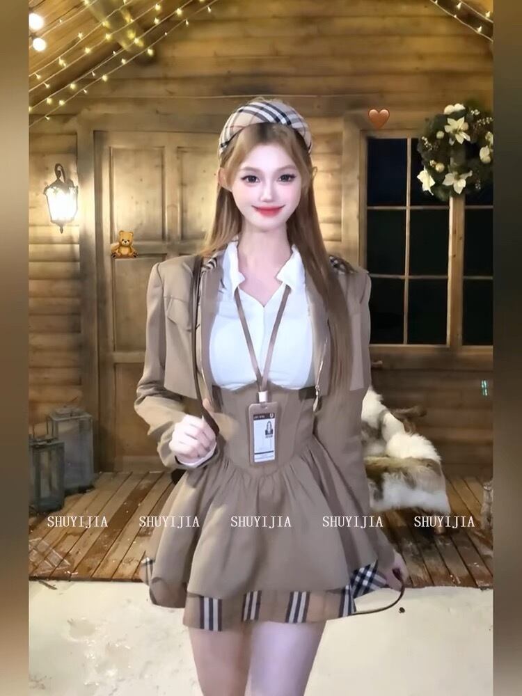 カレッジ風 チェック柄ミックスジャケット+ハイウエストミニスカセットアップ2点セット※シャツは付属しません※